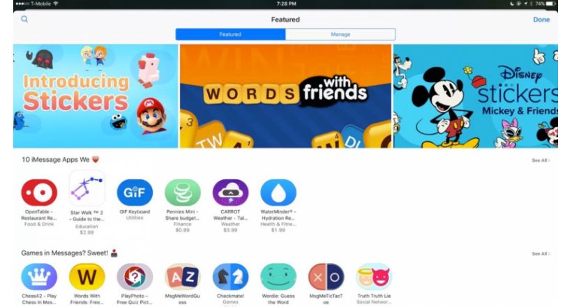 Apple ha presentado antes del lanzamiento de iOS 10 el nuevo iMessage App Store, que incluye packs de stickers de compañías como Disney, Bandai Namco, Sanrio y otras. Además ofrece aplicaciones y juegos, algunas que ya fueron presentadas en WWDC 2016 como Square Cash, Open Table y JibJab.