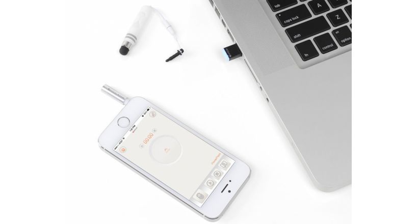 X-Presenter consiste de un puntero láser que se conecta a la entrada de auriculares de tu iPhone y un dongle USB que permite la comunicación entre el iPhone y tu PC o Mac en forma eficiente a través de Bluetooth, y permite controlar tanto el teclado como el mouse desde tu teléfono.