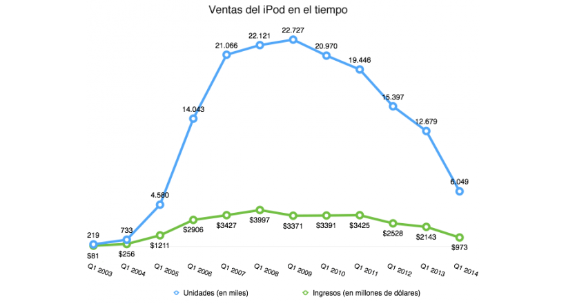 Tal vez lo más importante de los resultados del primer trimestre fiscal del 2014, que abarca toda la temporada de compras navideñas del 2013, fueron las ventas récord de iPhone y iPad, pero en este trimestre también se produjo la peor caída de las ventas en la historia del iPod.